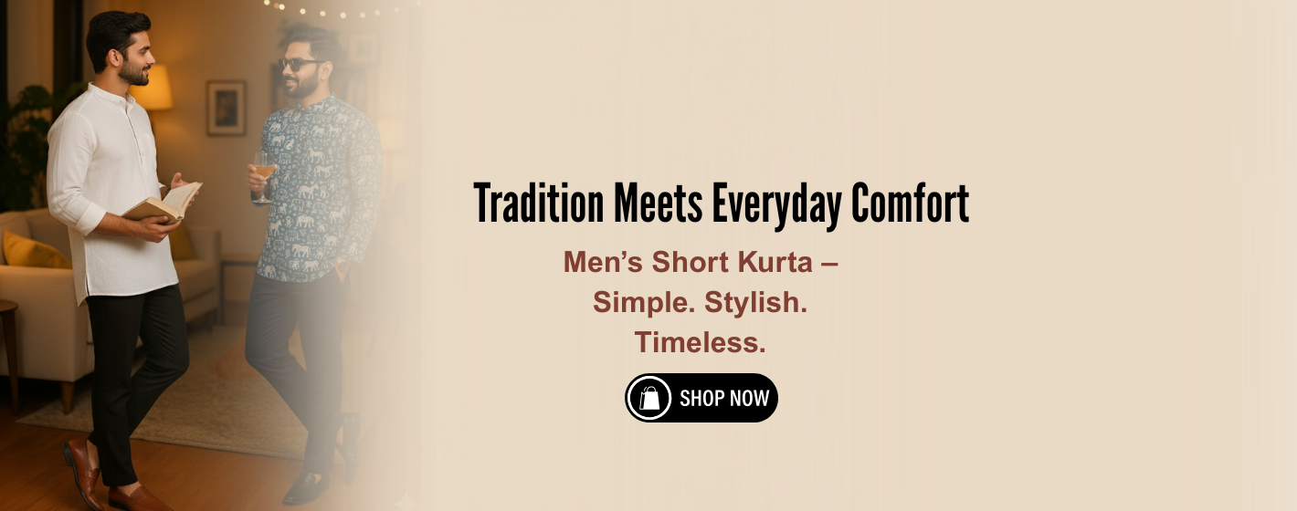 Men’s Short Kurta in White Cotton – Mandarin Collar