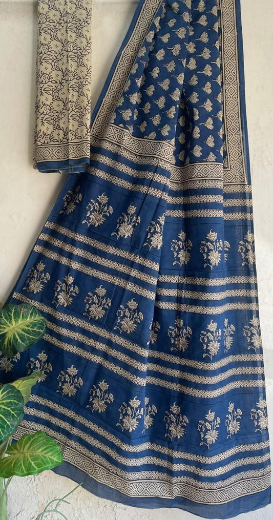 Navy Blue & Beige Cotton Malmal Hand Block Print Saree with Blouse – 5.5m Saree + 80cm Blouse Piece | Soft Lightweight Traditional Saree for Women