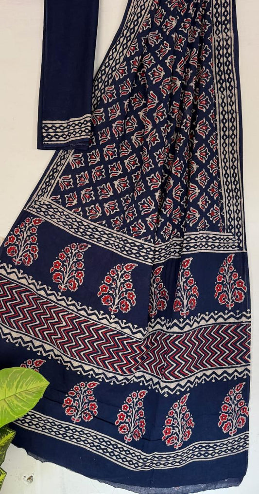 Navy Blue Cotton Malmal Hand Block Print Saree with Blouse – 5.5m Saree & 80cm Blouse Piece | Soft Lightweight Traditional Saree for Women