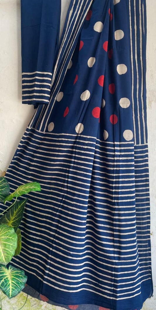 Navy Blue Cotton Malmal Hand Block Print Saree with Red & White Polka Dots – 5.5m Saree + 80cm Blouse Piece | Soft Lightweight Saree for Women