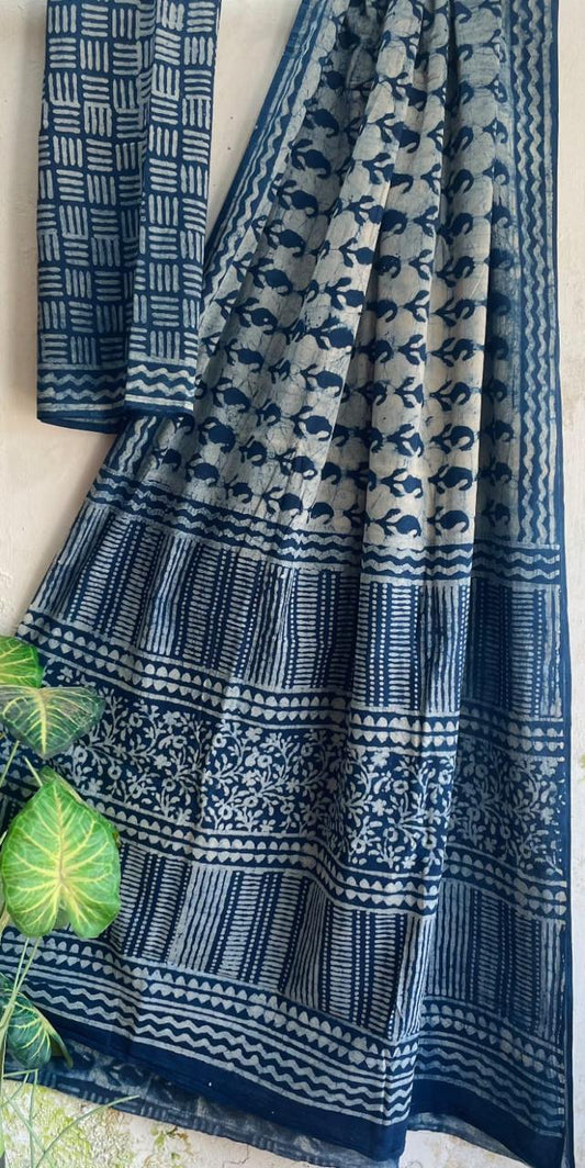 Pure Cotton Malmal Hand Block Print Saree with Blouse Piece – 5.5m Saree + 80cm Blouse Fabric | Lightweight & Breathable Traditional Saree for Women