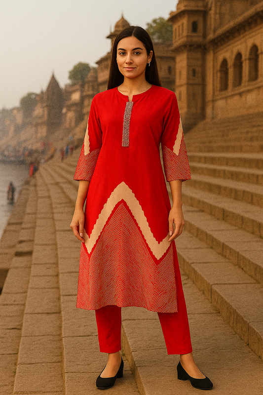 Red Maslin Printed Kurti Set for Women – Stylish Everyday Wear with Modern Chevron Design