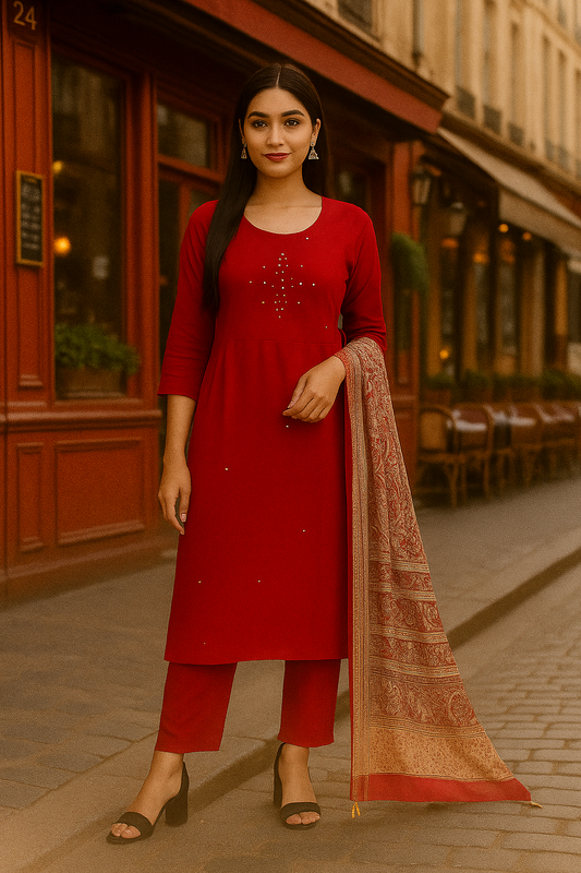 Red Maslin Mirror Work Kurti Set with Printed Dupatta – Elegant Festive Wear for Women