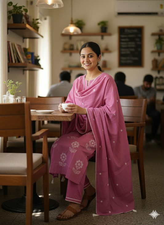 Women’s Pink Cotton Embroidered Kurti Pant Dupatta Set | Soft Summer Ethnic Suit Set