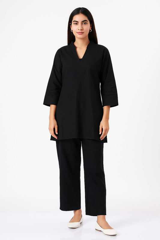 Classic Black Pure Cotton Co-ord Set with V-Neck Kurta and Straight Pants