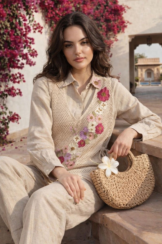 Women’s Designer Jute 3-Piece Co-Ord Set – Floral Appliqué Coat, Straight Pants & Spaghetti Top | Festive & Party Wear
