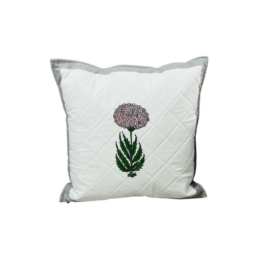 Premium Embroidered Floral Quilted Cushion Cover – White & Grey