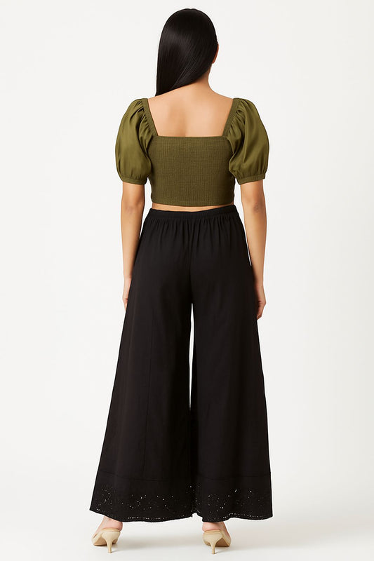 Women’s Black Cotton Palazzo Pants with Pocket & Embroidered Hem – Stylish Wide Leg Bottoms
