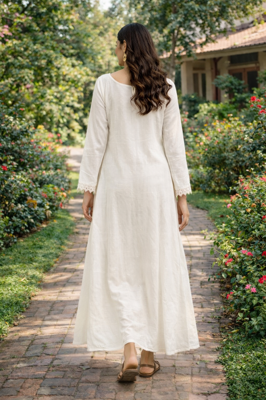 Women’s Supernet Cotton Long Dress with Cotton Inner – White A-Line Ethnic Dress, Lightweight Summer Dress