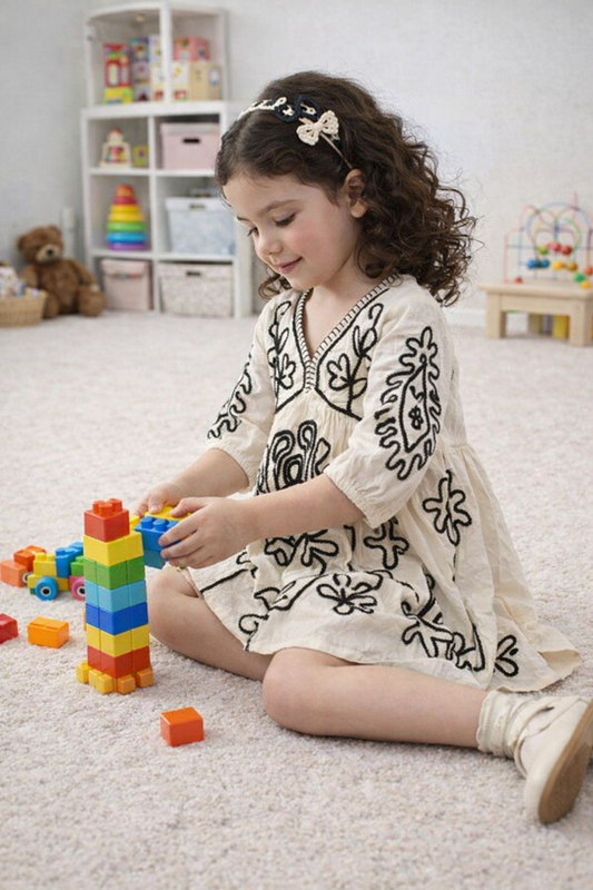 Girls Cotton Embroidered Dress – Cream & Black Floral Baby Girl Frock, Soft Casual & Party Wear Kids Dress