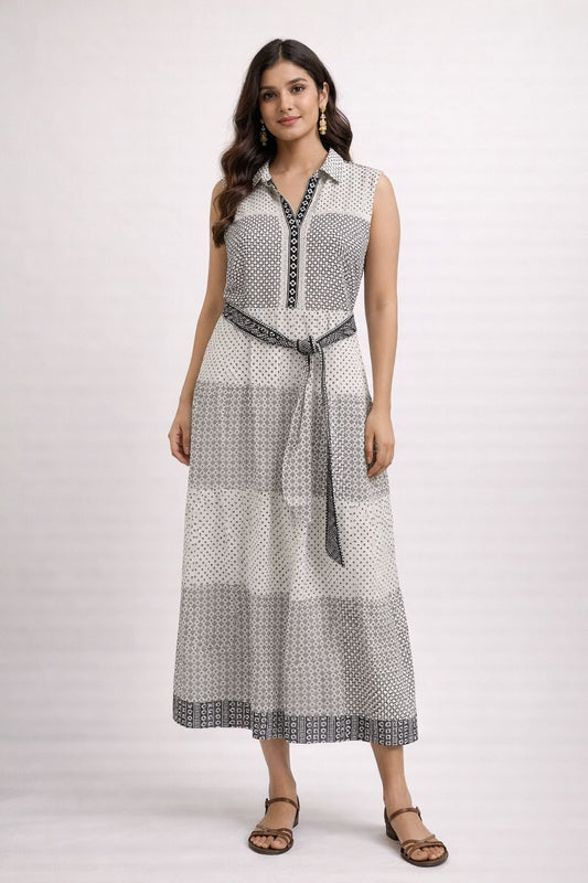 Women’s Cotton Printed Midi Dress – Black & White Sleeveless Summer Dress with Belt, Casual & Travel Wear
