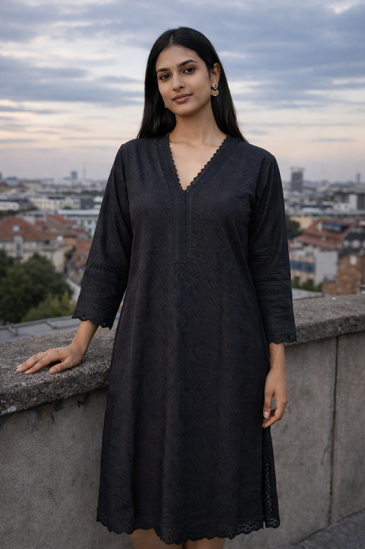 Women’s Black Cotton Kurti with Lace Detailing | Handcrafted Straight Kurta, Soft & Breathable