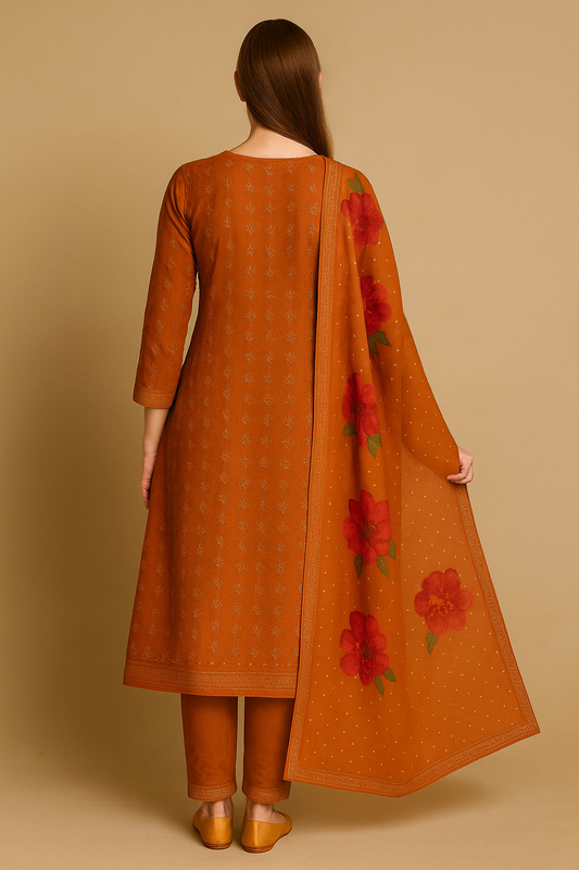 Rust Orange Rayon Kurti Set with Embroidered Neckline & Floral Dupatta – Elegant Ethnic Wear for Women