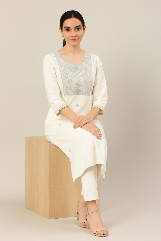 Cotton Kurti Set with Floral Embroidered Yoke & Subtle Detailing