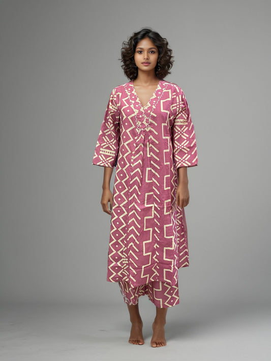 Blush Pink Geometric Print Cotton Kurta Set with Pleated Neckline
