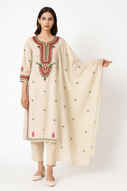 Elegant Beige Embroidered Cotton Suit Set with Dupatta