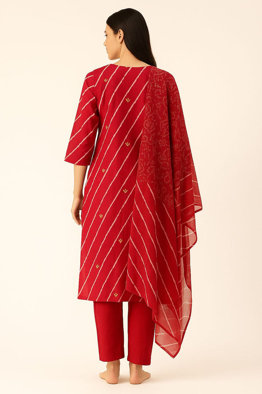 Red Bandhej-Inspired Embroidered Cotton Kurti Set with Dupatta