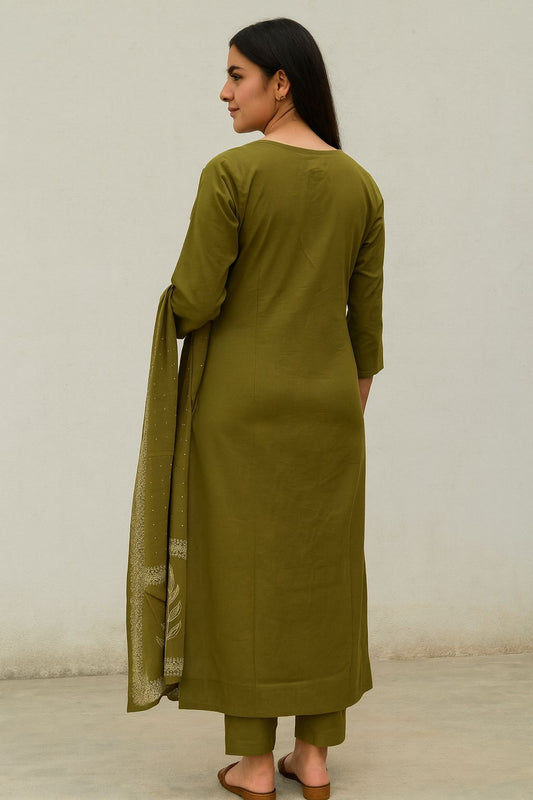 Olive Green Cotton Kurti Set with Botanical Print & Matching Dupatta – Natural Fab