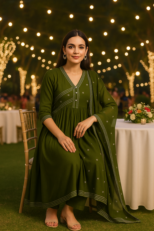 Olive Green Embroidered Cotton Kurti Set with Dupatta – Elegant Ethnic Wear for Women | Natural Fab