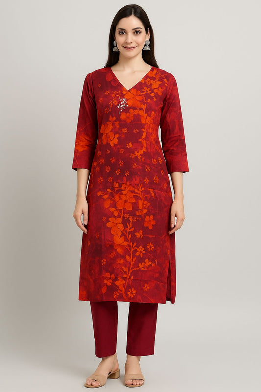 Women’s Red Maslin Kurti Set with Floral Print – Stylish Ethnic Wear for Festive & Office Look