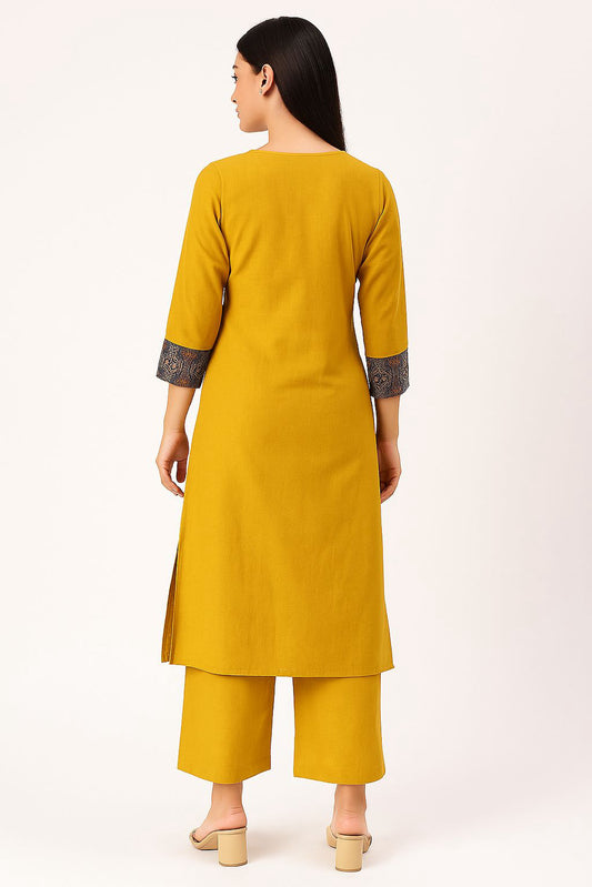 Mustard Yellow Cotton Kurta Set for Women | Handcrafted Embroidered Kurti with Palazzo | Ethnic Wear by Natural Fab