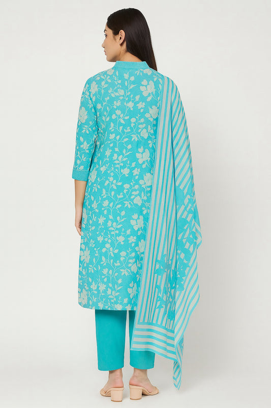 Blue Floral Print Cotton Kurti Set with Striped Dupatta – Summer Ethnic Wear