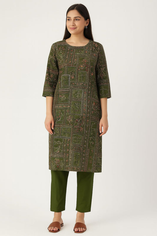 Elegant Olive Green Cotton Kurti Set with Elephant Embroidery | Ethnic Wear for Women