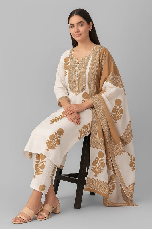 White & Beige Floral Print Cotton Kurti Set with Dupatta – 3 Piece Ethnic Wear for Women