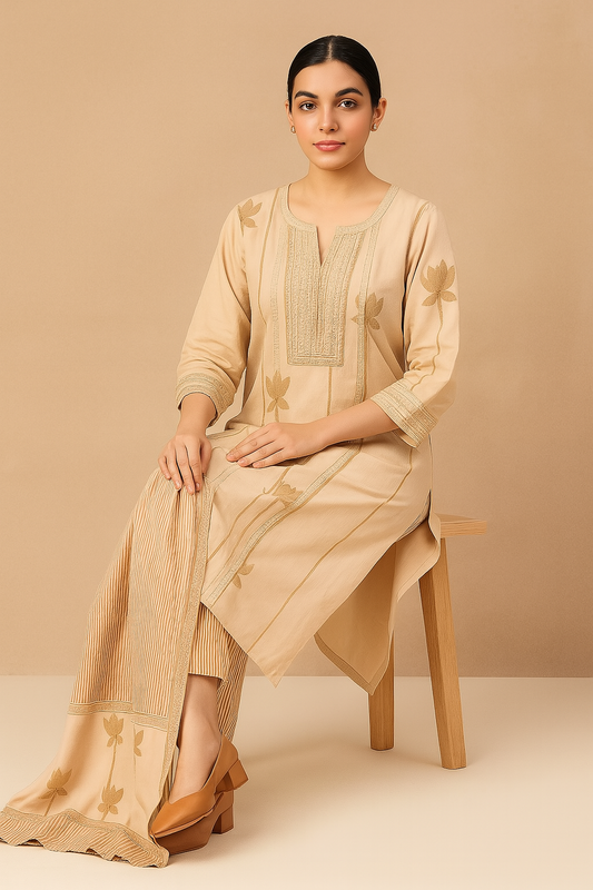 Elegant Beige Cotton Kurti Set with Lotus Print and Striped Dupatta – 3 Piece Ethnic Set for Women