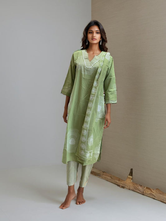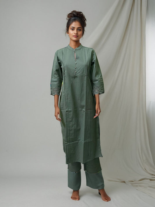 Mint Meadow 100% Cotton Embroidered Kurti Set – Subtle Elegance