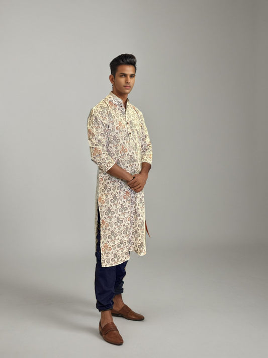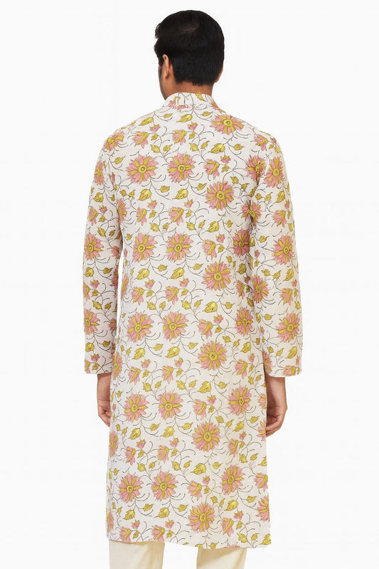 Men's Floral Handblock Printed Cotton Long Kurta – Cream Base with Pink & Yellow Motifs