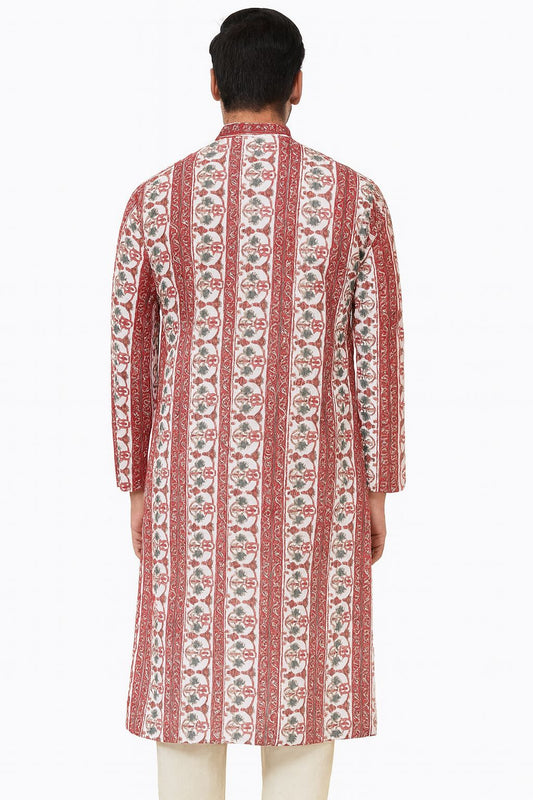 Men's Handblock Printed Long Cotton Kurta – Red & White Vertical Floral Stripe Pattern