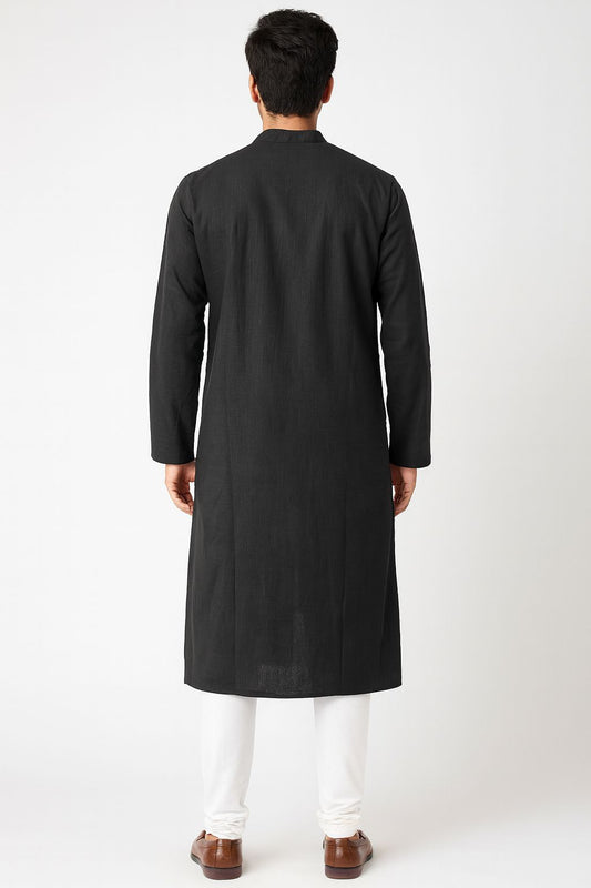 Black Khadi Cotton Kurta for Men | Handwoven Ethnic Long Kurta with Pocket
