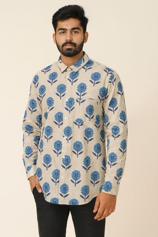Men’s Pure Cotton Printed Shirt – Blue Floral Hand Block Print on Beige | Full Sleeves | Natural Fab