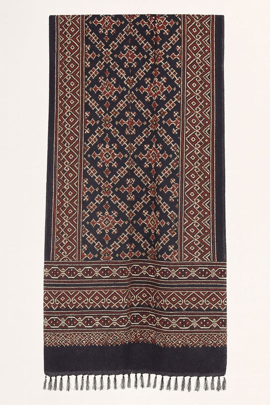 Handcrafted Ajrakh Silk Stole in Black & Maroon | Traditional Geometric Tassels