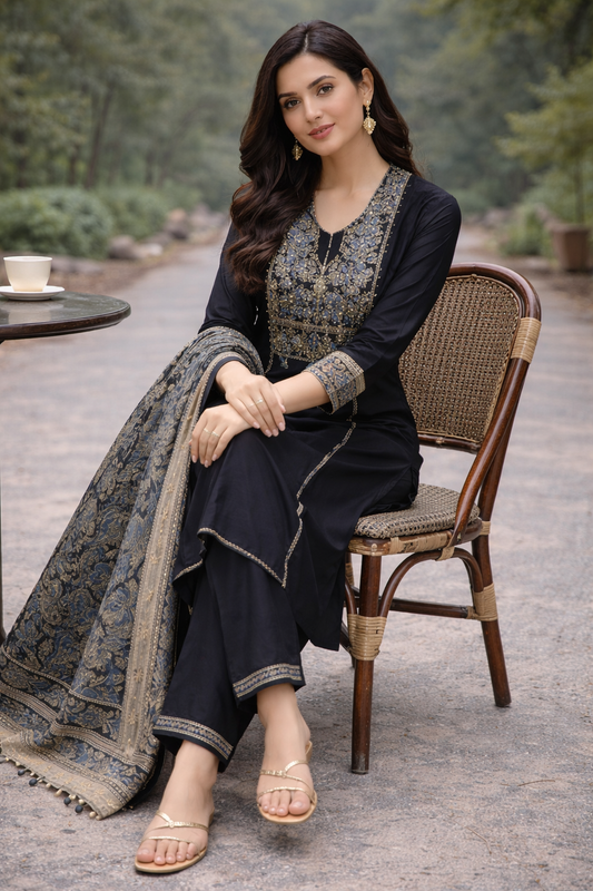 Black Embroidered Cotton Kurti Set for Women with Dupatta – Elegant Ethnic Kurta Pant Set | Natural Fab