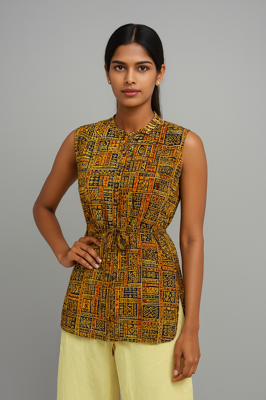 Short Kalamkari Sleeveless Kurti with Drawstring Waist