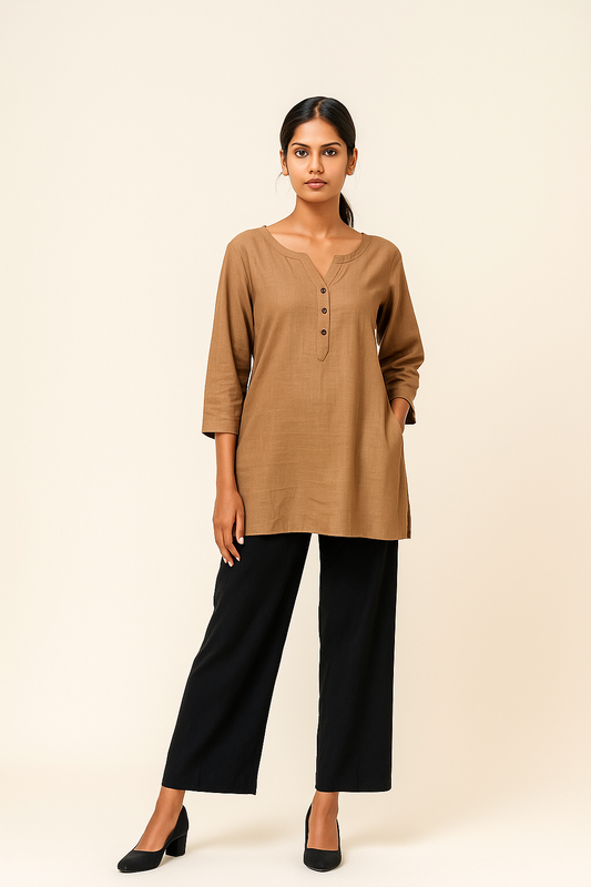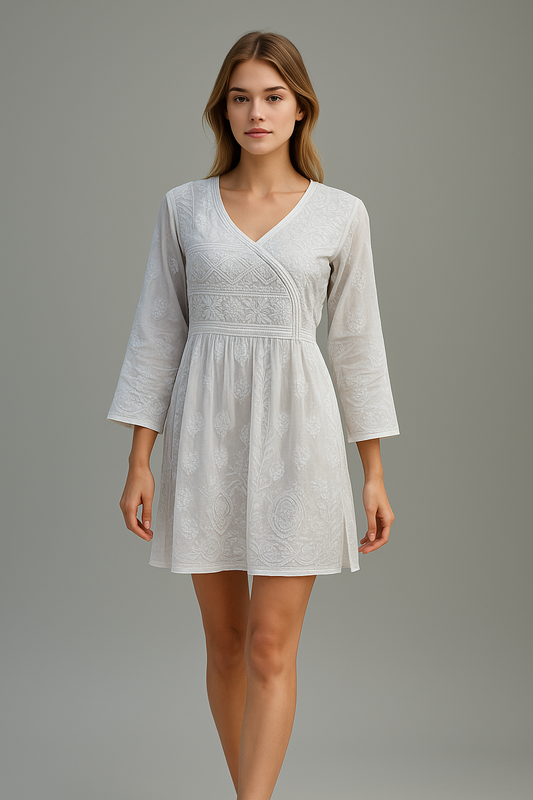 Chikankari-Inspired Malmal Cotton Short Kurti in Soft Beige