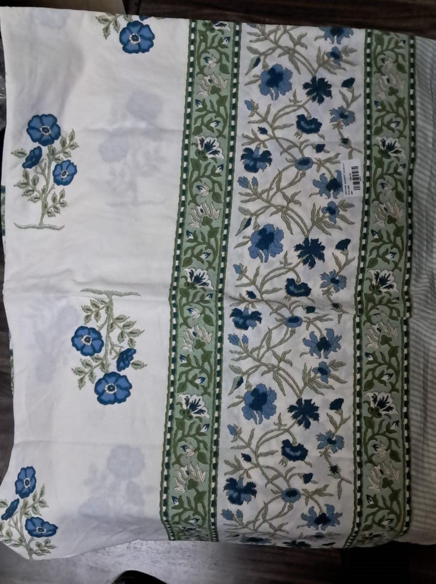 Bring freshness and elegance to your bedroom with this blue and green floral printed cotton double bedsheet set. Crafted from 100% pure cotton, the fabric is soft, breathable, and gentle on the skin, ensuring a comfortable sleep every night. Designed in a generous size of 100x108 inches, this bedsheet is ideal for king-size beds. The set also includes 2 matching pillow covers, perfectly complementing the floral block print design. Stylish, durable, and easy to maintain, this bedsheet set is perfect for daily use, festive décor, or gifting.