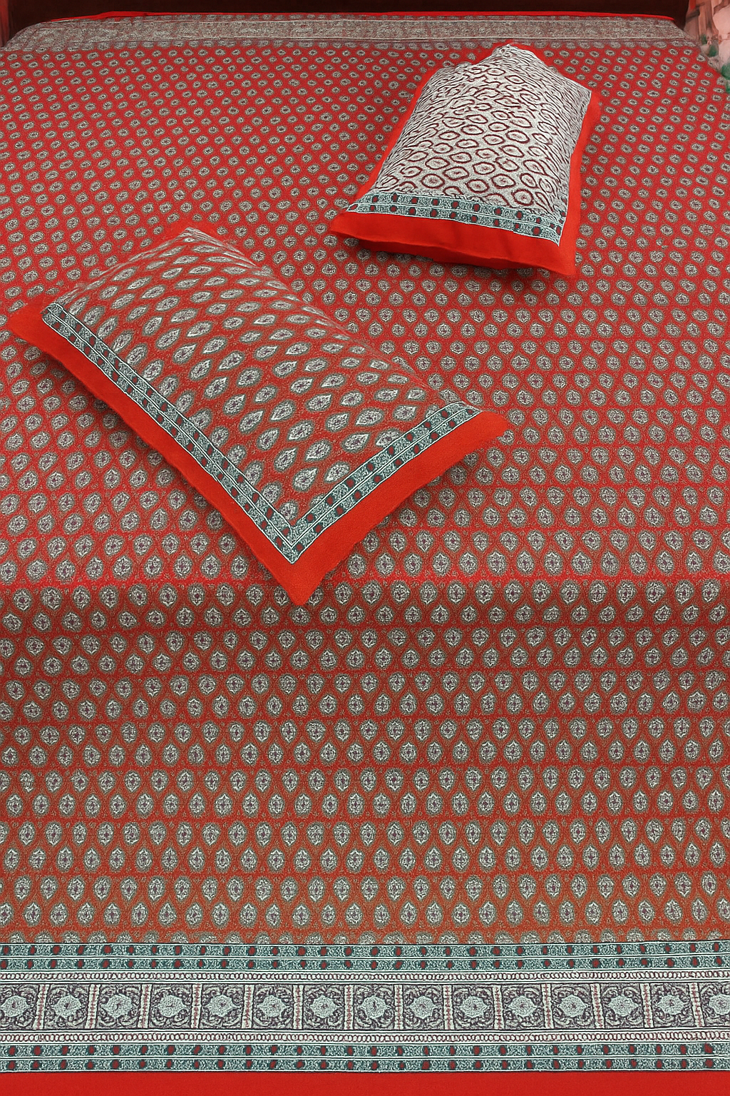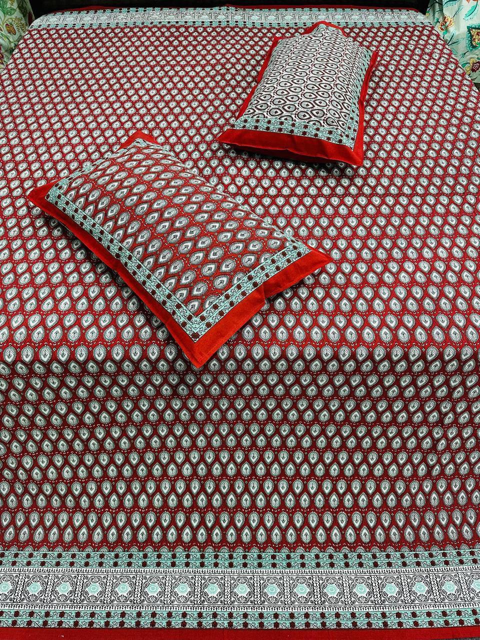 100% Cotton Double Bedsheet with Pillow Covers – Red Traditional Print, Size 100x108 Inches