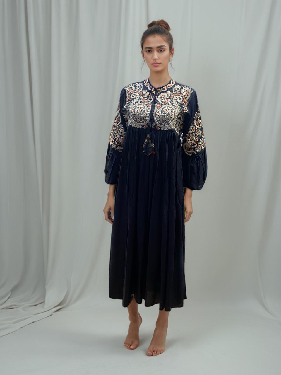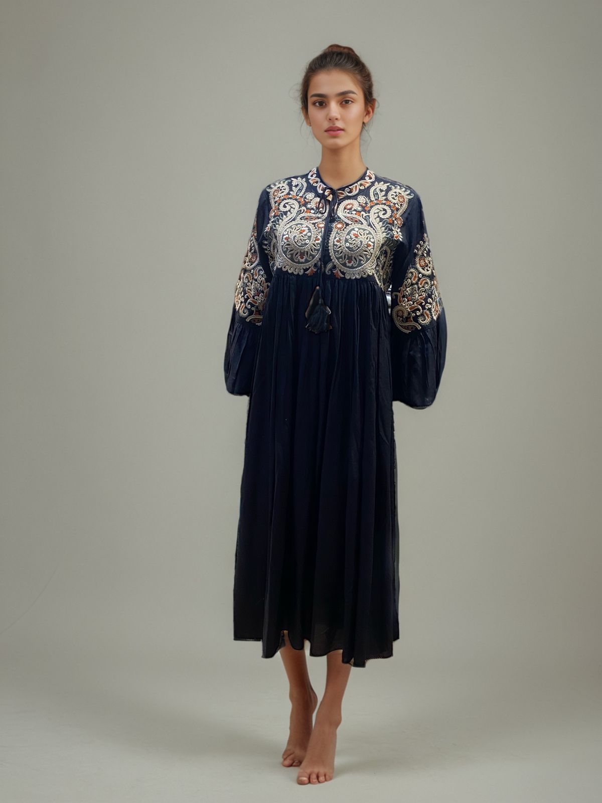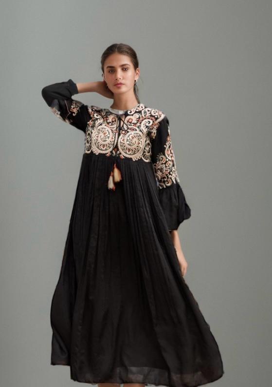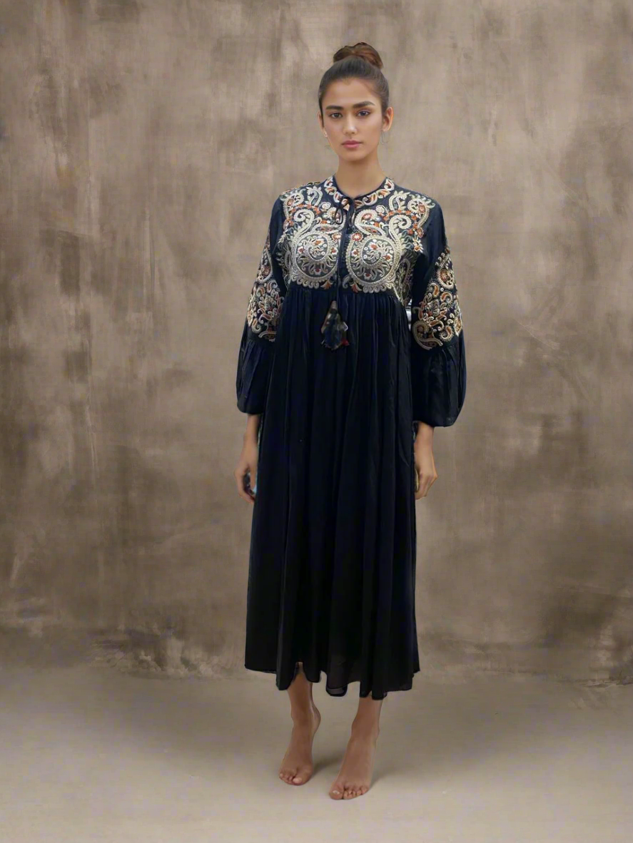 Embrace elegance and comfort with this black cotton dress, designed to make a statement at every occasion. Featuring exquisite embroidery work on the yoke and sleeves, this dress blends traditional craftsmanship with modern charm. The flowy silhouette ensures ease of movement, while the bell sleeves and tassel detailing add a touch of sophistication.