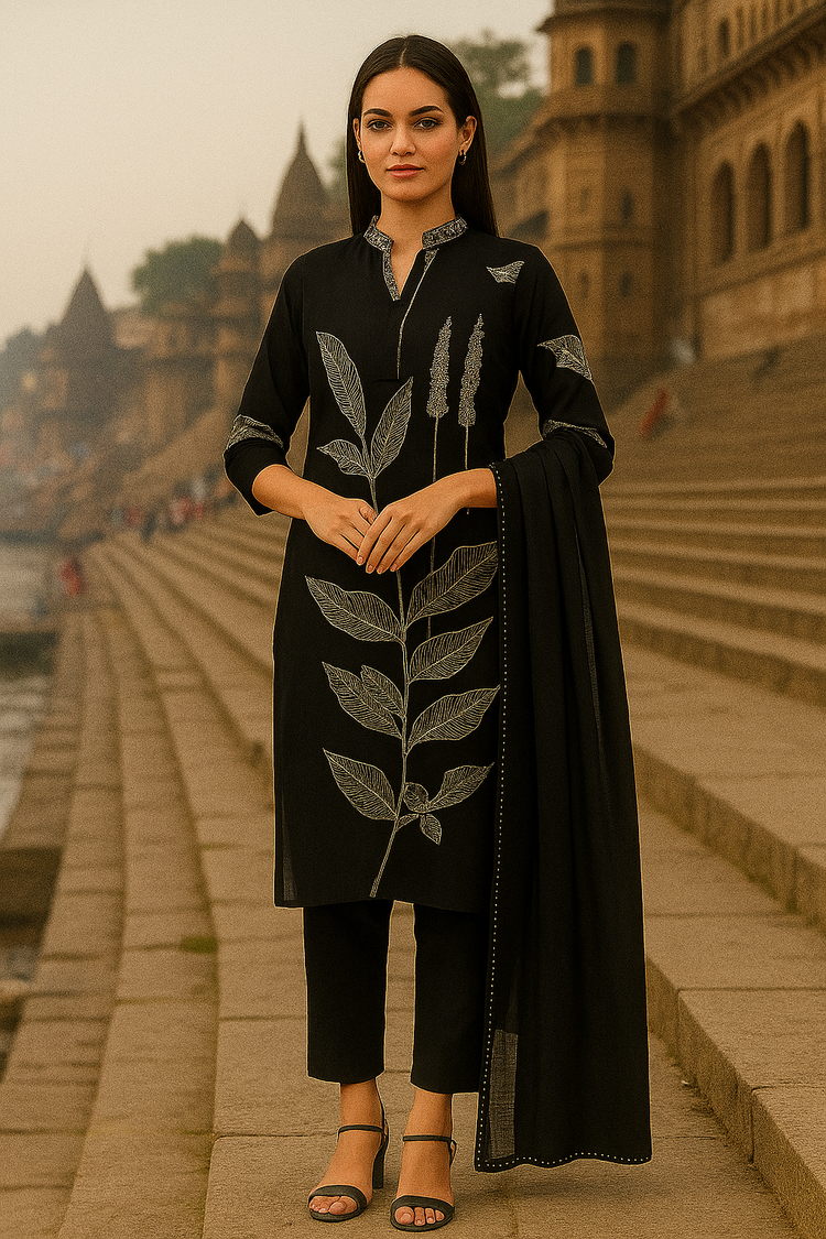 Black Maslin Embroidered Kurti Set with Dupatta – Elegant 3-Piece Ethnic Wear for Women