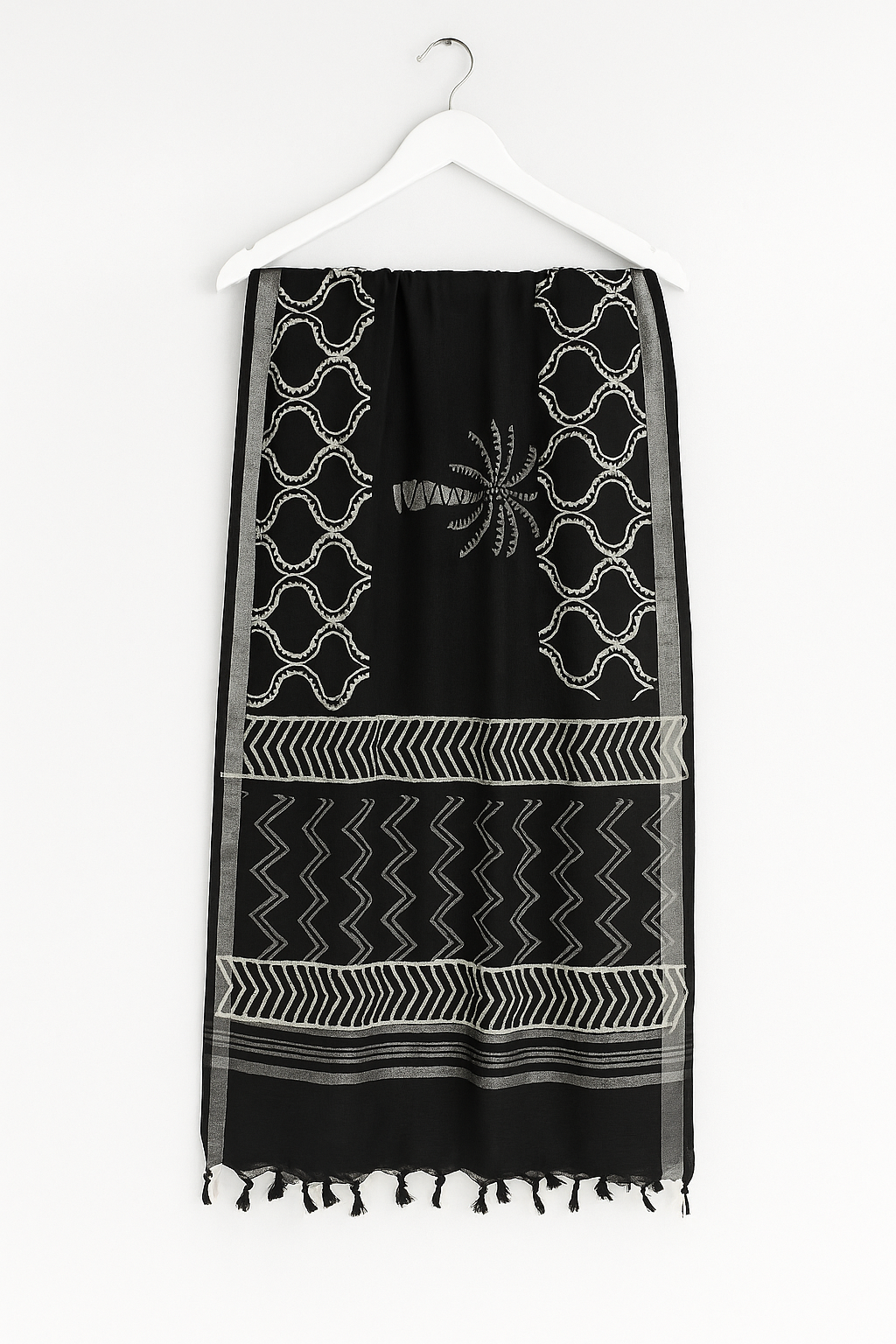 Embrace timeless elegance with this black handblock printed cotton dupatta, adorned with bold white zigzag and geometric patterns. Made from lightweight, breathable cotton, this dupatta features a beautifully balanced mix of symmetrical motifs, tribal designs, and traditional borders. Finished with monochrome tassels, it's perfect for pairing with plain kurtas, suits, or Indo-fusion outfits. Ideal for casual wear, office, or festive occasions, this dupatta adds a striking yet classic touch to any look.