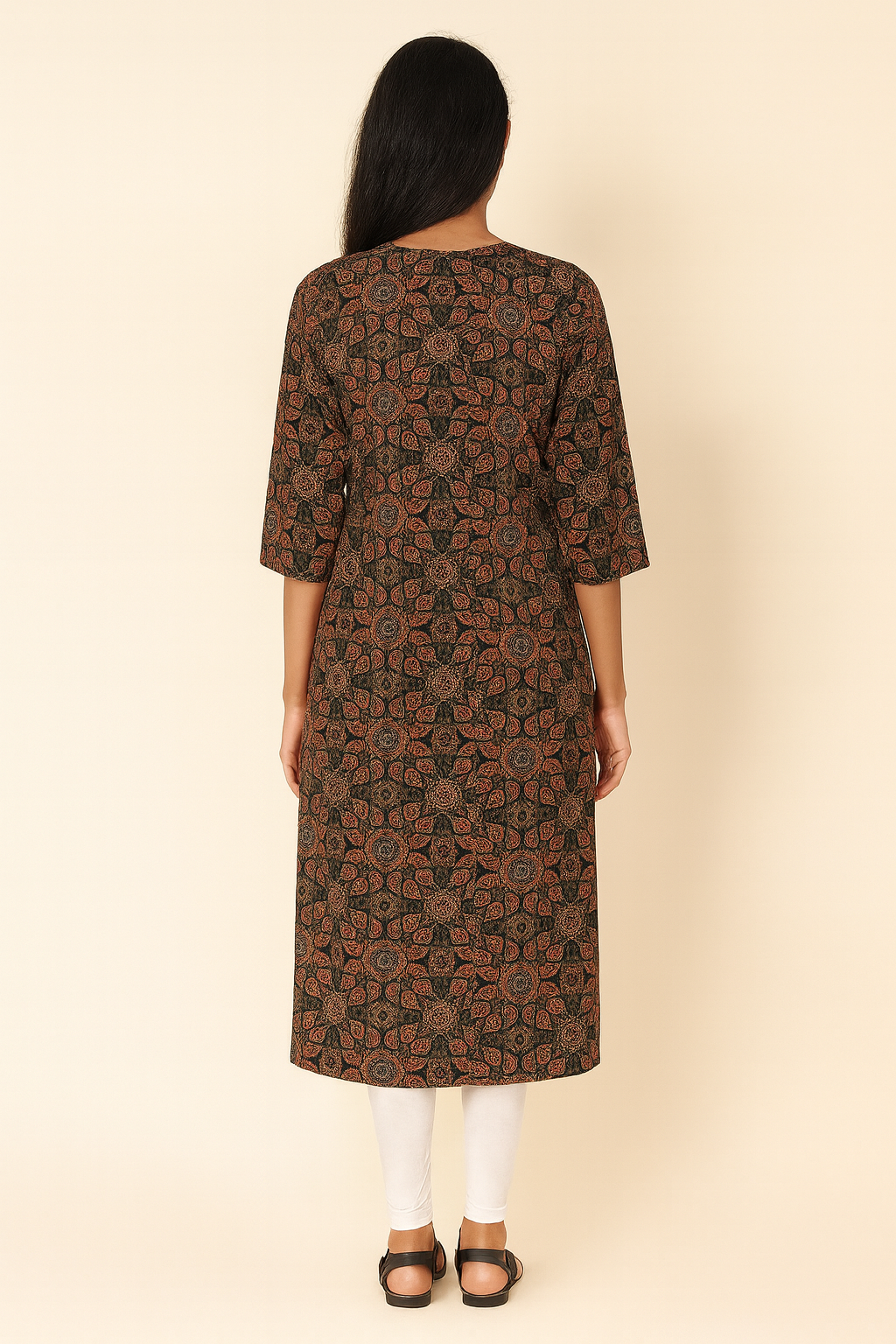 Enhance your ethnic look with this black & rust cotton printed kurti featuring intricate circular motifs, a round notch neckline, and 3/4th sleeves. Designed in a handblock-inspired print, this kurti combines traditional artistry with modern elegance. Made from breathable cotton fabric, it offers comfort for daily wear, office wear, festive occasions, and casual outings. Style it with leggings, palazzos, or pants for a versatile ethnic appearance. A perfect choice for women who love stylish and comfortable cotton kurtis.