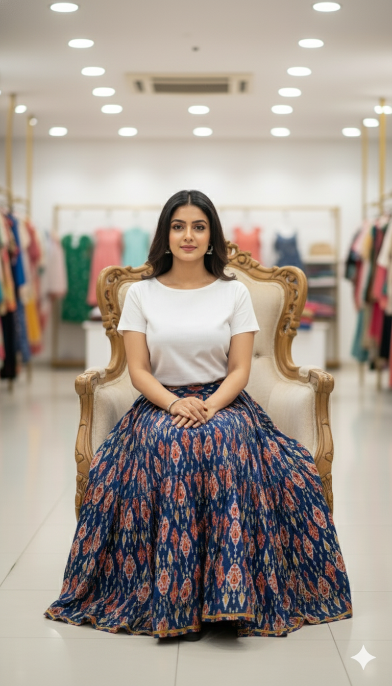 Step into timeless elegance with this blue handblock printed cotton skirt for women, featuring exquisite Ikat-inspired motifs in vibrant shades of red, mustard, and white. Designed with a flowy full-flare silhouette and crafted from soft, breathable cotton, this skirt offers both comfort and traditional charm. Perfect for festive occasions, travel, or everyday ethnic wear, it pairs beautifully with plain tops or kurtas. Celebrate handcrafted Indian artistry with Natural Fab’s ethnic skirt collection – sustainable, stylish, and effortlessly beautiful.