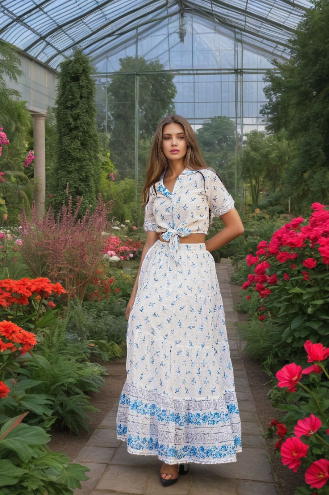 Step into effortless grace with this stunning blue and white floral co-ord set, designed for those who love timeless elegance with a touch of bohemian charm. The cropped tie-up shirt features delicate floral prints, a classic collar, and airy short sleeves, offering a breezy yet structured look. Paired with a flowy maxi skirt adorned with intricate blue floral motifs and lace detailing, this ensemble radiates feminine allure and comfort.