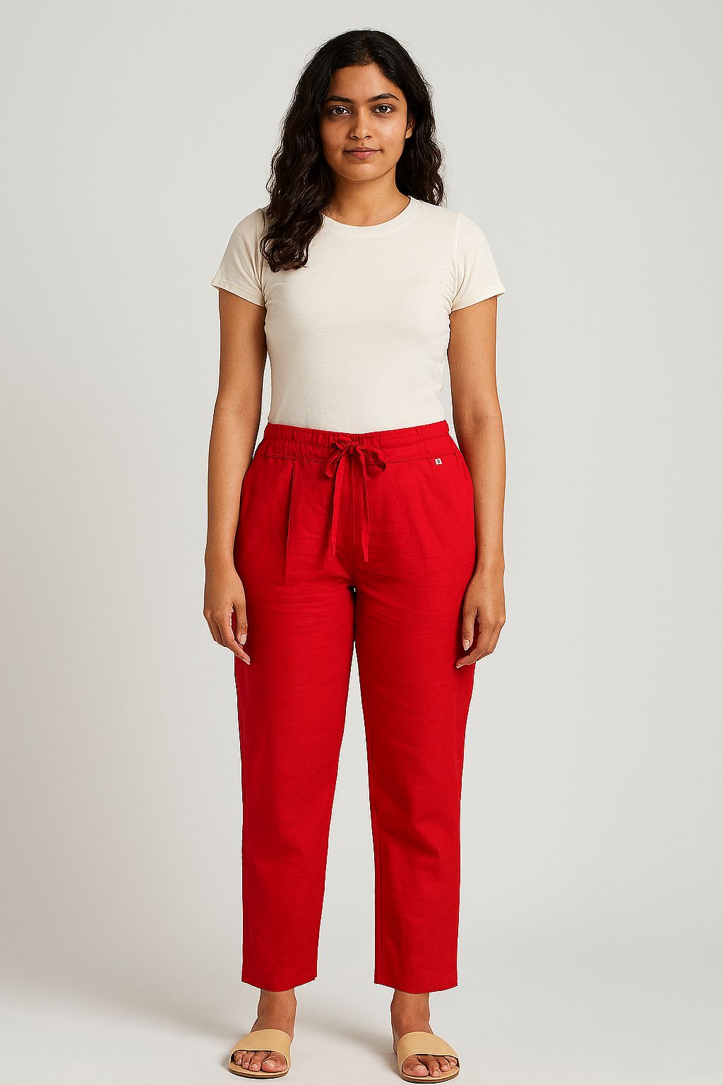 Make a striking style statement with these bold red cotton pants crafted for everyday ease and flair. Tailored from soft, breathable cotton, they feature a relaxed straight fit, elasticated waist with a drawstring, and functional side pockets. Whether you're lounging, running errands, or dressing up for a casual brunch, these pants promise unmatched comfort and vibrant style.