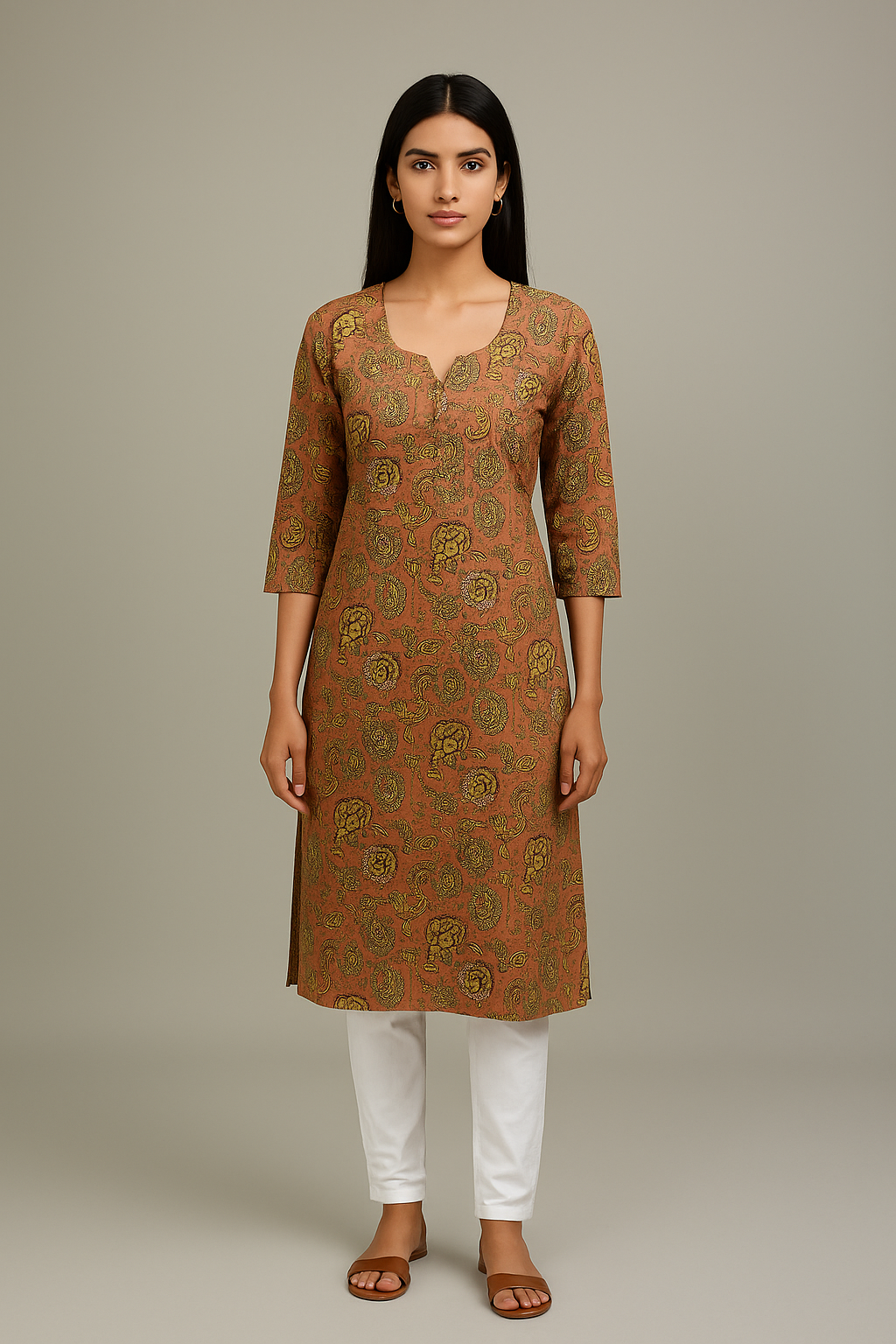 Celebrate simplicity with style through our yellow khadi cotton kurti. Detailed with traditional block prints, this kurti captures India’s rich textile legacy. Ideal for women who value heritage and fashion equally. Designed for everyday wear, its lightweight material keeps you cool and relaxed. Pair it with cotton pants or ethnic skirts to complete the look. The natural dyes used in printing are skin-friendly and eco-conscious. A versatile piece that complements every occasion—be it a day at the office or a festive gathering. Experience slow fashion with purpose,