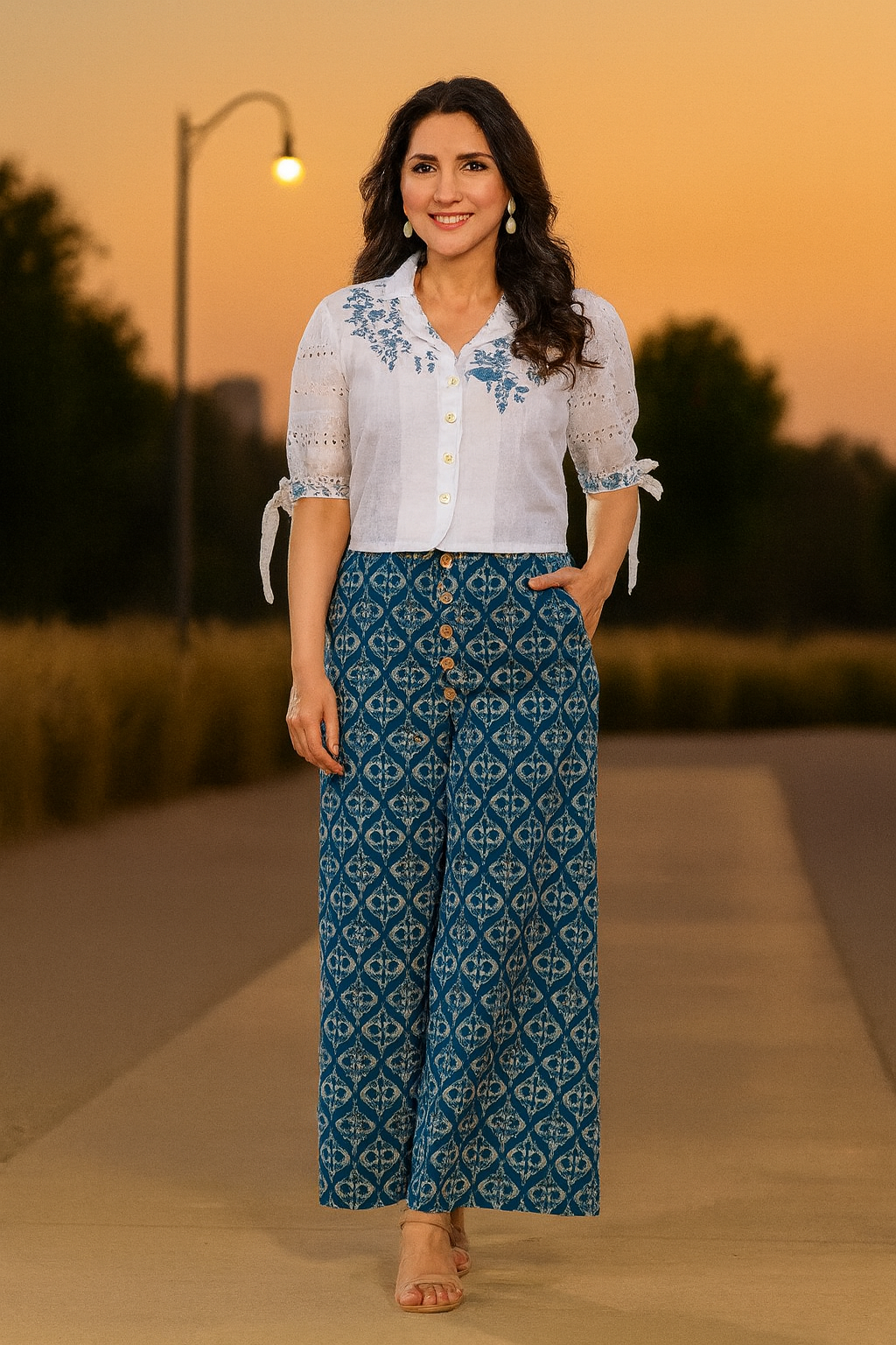 Redefine your everyday style with this stunning white cotton shirt and blue printed palazzo set. The white button-down shirt features delicate floral embroidery, lace detailing on sleeves, and stylish tie-up accents, adding a touch of sophistication. Paired with flowy, high-waisted palazzo pants adorned with intricate traditional prints, this ensemble offers both comfort and elegance.