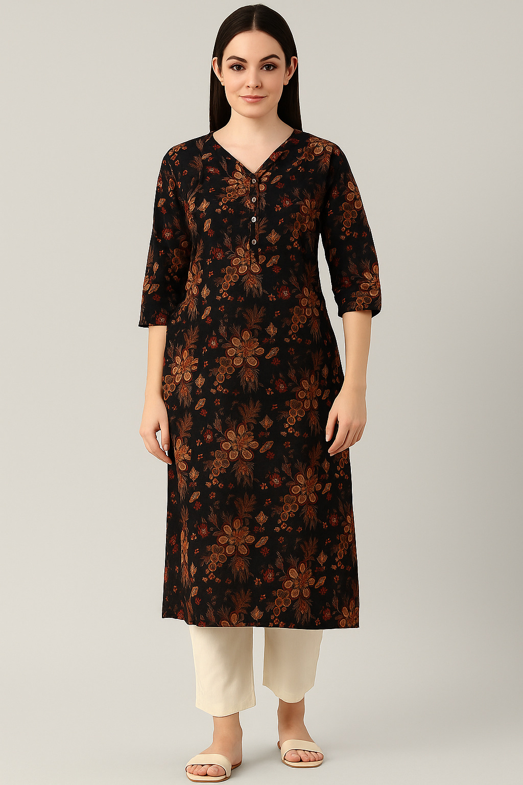 Add timeless elegance to your wardrobe with this black floral printed cotton kurta for women. Made from soft, breathable cotton fabric, this straight-fit kurta features a classic V-neckline, button detailing, and 3/4th sleeves for a flattering silhouette. Perfect for office wear, festive occasions, or everyday comfort, the warm-toned floral print adds a touch of tradition to your modern style. Pair it with beige or white pants for a balanced ethnic look. Ideal for women who prefer stylish yet comfortable Indian wear.
